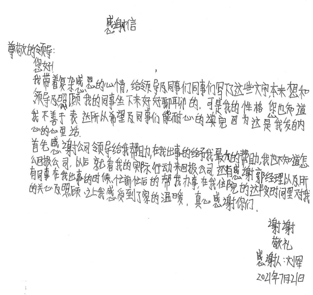 经过半个月治疗休养,刘军手部已无大碍。出院后的他写了一封感谢信并为公司送了一面锦旗,他说道,是安博app登录入口这个大家庭让他感受到了关怀和温暖,他表示要把这种关怀变成工作上的动力,争取早日返回工作岗位,努力工作,回报大家的关心和关爱。