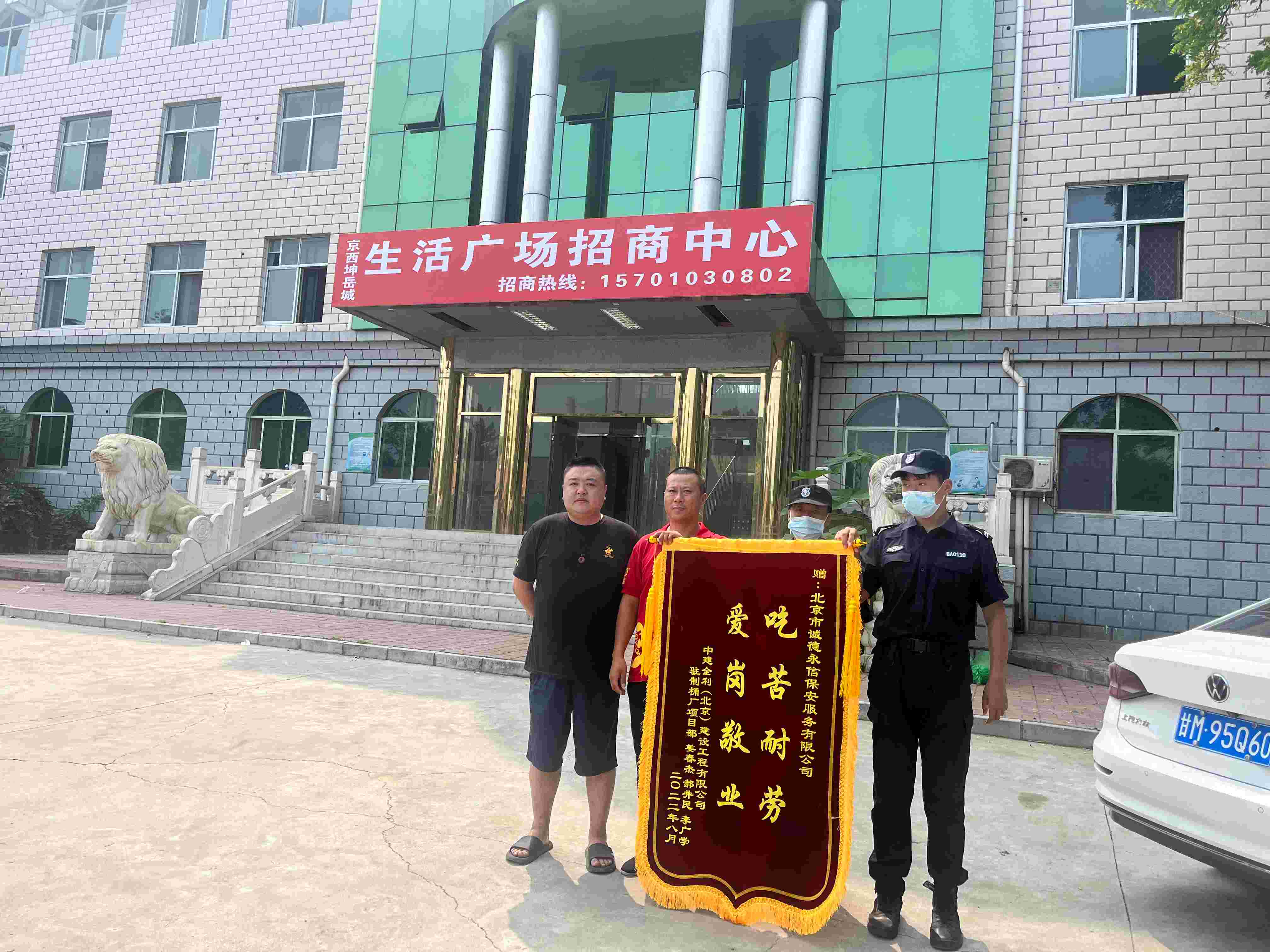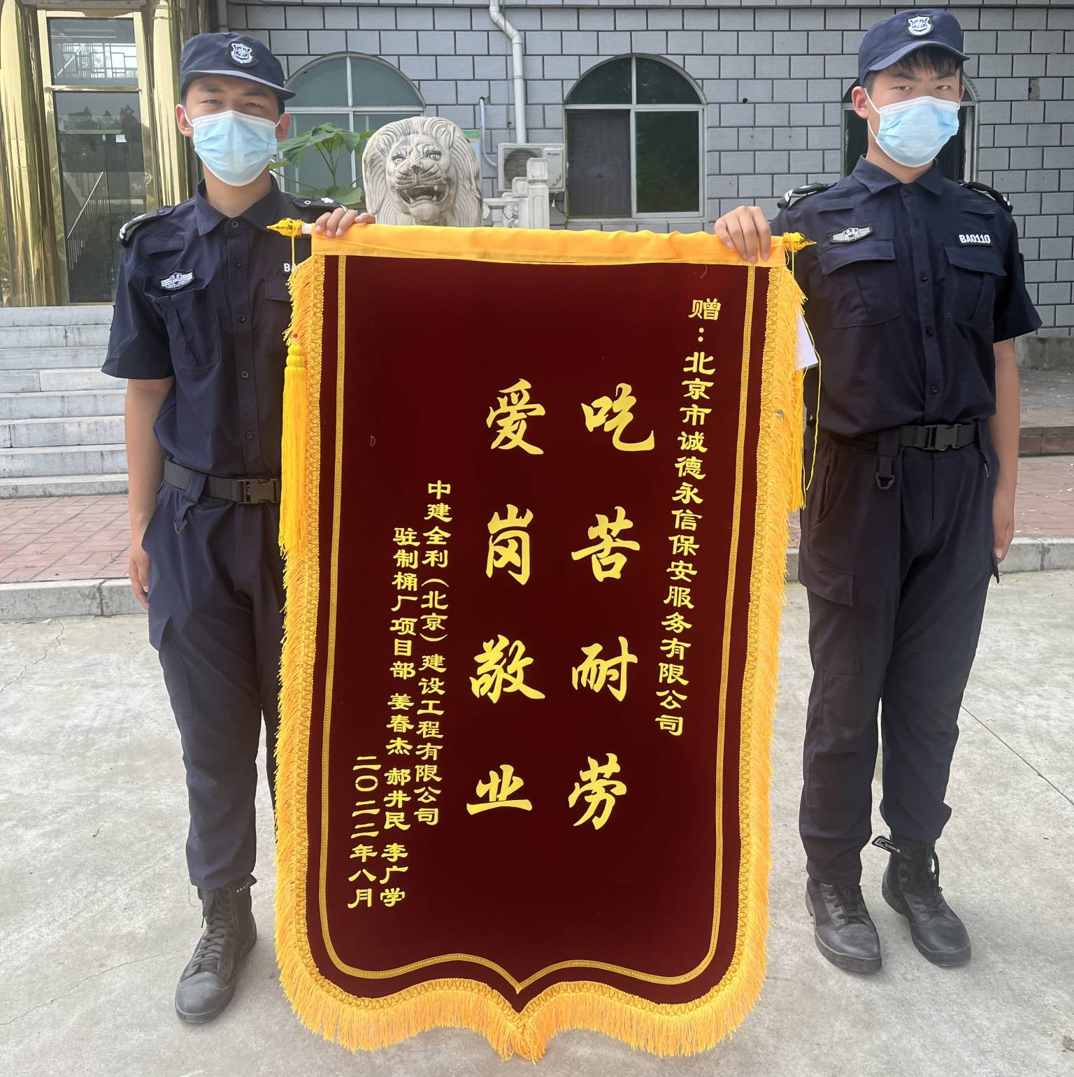 2022年8月1日,中建全利招商办公处驻制桶厂项目部由姜春杰等人为代表,将一面绣有“吃苦耐劳,爱岗敬业”的锦旗送到北京市安博app登录入口保安服务有限公司项目负责人的手中,对我司保安队的优异工作表现表示诚挚的感谢。